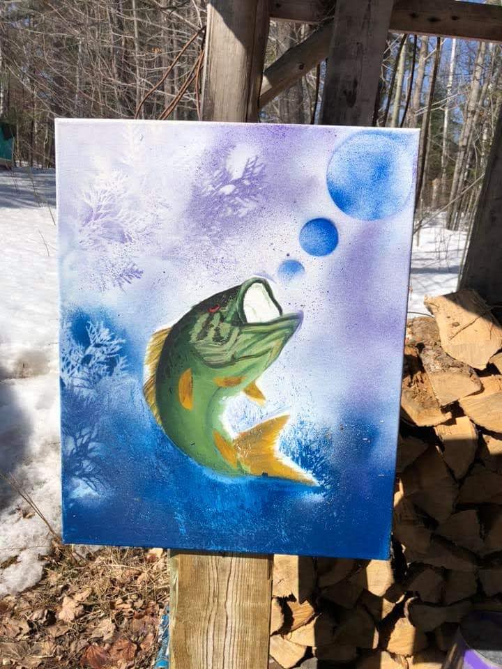 Spray paint, acrylic, pastels, you name it she plays with it. She is known for her creativity using things in her environment, painting with brushes, stencils, lids and even cedar branches. She will sometimes use other materials around her just depends what shes’ feeling