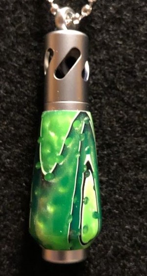 This hand turned acrylic pendent is a vibrant green speckled with black and white contrasting lines. This one of a kind pendant has a satin chrome finish. Set comes with, pendant, 5 wicks, vile of essential oil, and a velvet pouch.