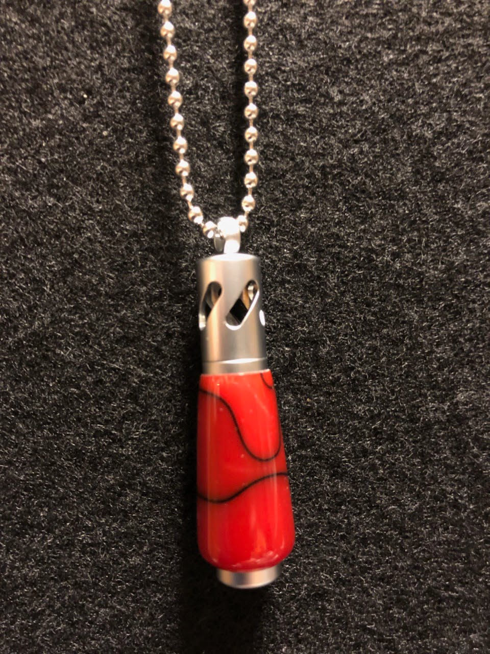 This hand turned acrylic pendent, is red with black lining across the surface. This one of a kind pendant has a satin chrome finish. Set comes with, pendant, 5 wicks, vile of essential oil, and a velvet pouch.