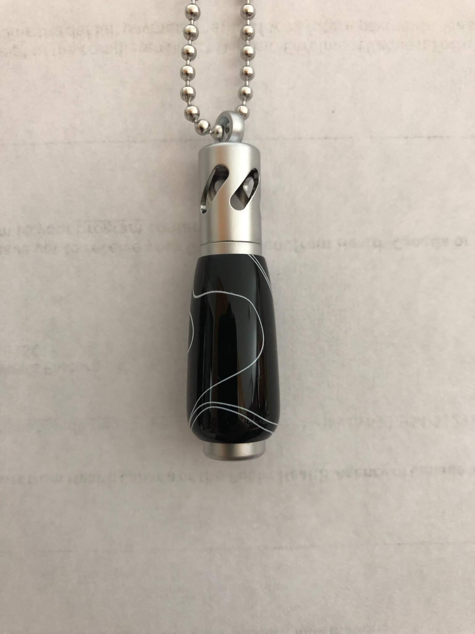 This hand turned acrylic pendent, is black with white strikes around the surface. This pendant has a satin chrome finish. Set comes with, pendant, 5 wicks, vile of essential oil, and a velvet pouch.