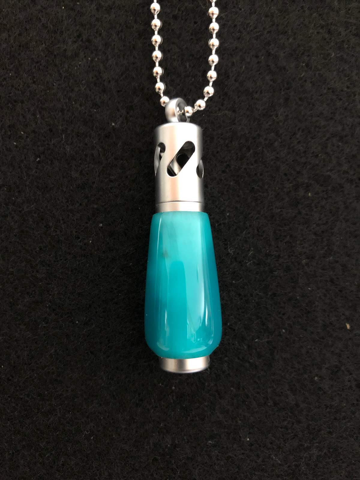 This hand turned acrylic pendent, is a beautiful sea blue across the surface. This one of a kind pendant has a satin chrome finish. Set comes with, pendant, 5 wicks, vile of essential oil, and a velvet pouch.