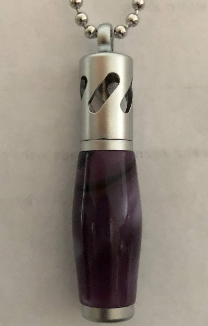 This hand turned acrylic pendent, is a deep purple, with lighter and darker ribbons around the surface. This one of a kind pendant has a satin chrome finish. Set comes with, pendant, 5 wicks, vile of essential oil, and a velvet pouch.