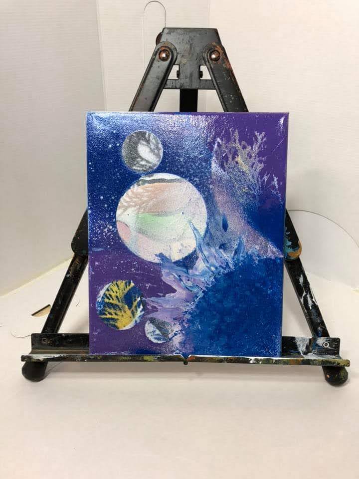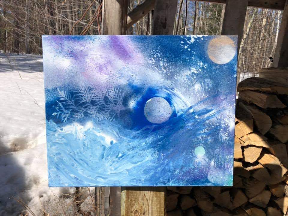 Spray paint, chalk, pastels, you name it she plays with it. She is known for her creativity using things in her environment, painting with brushes, stencils, lids and even cedar branches. She will sometimes use other materials around her just depends what shes’ feeling.