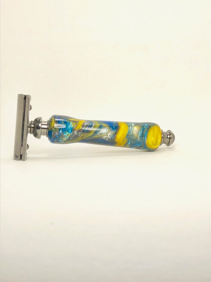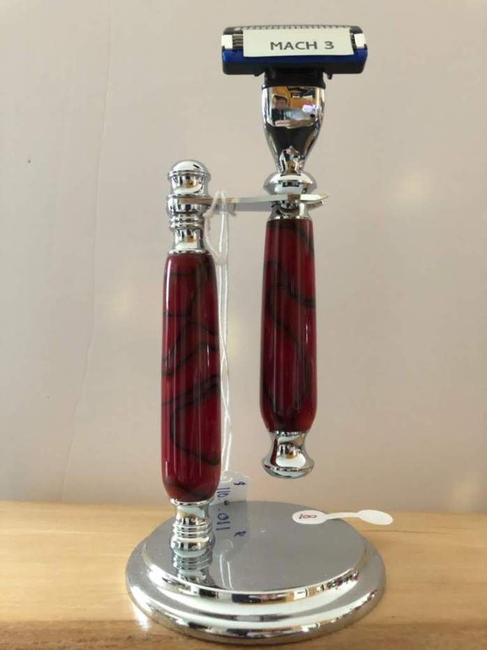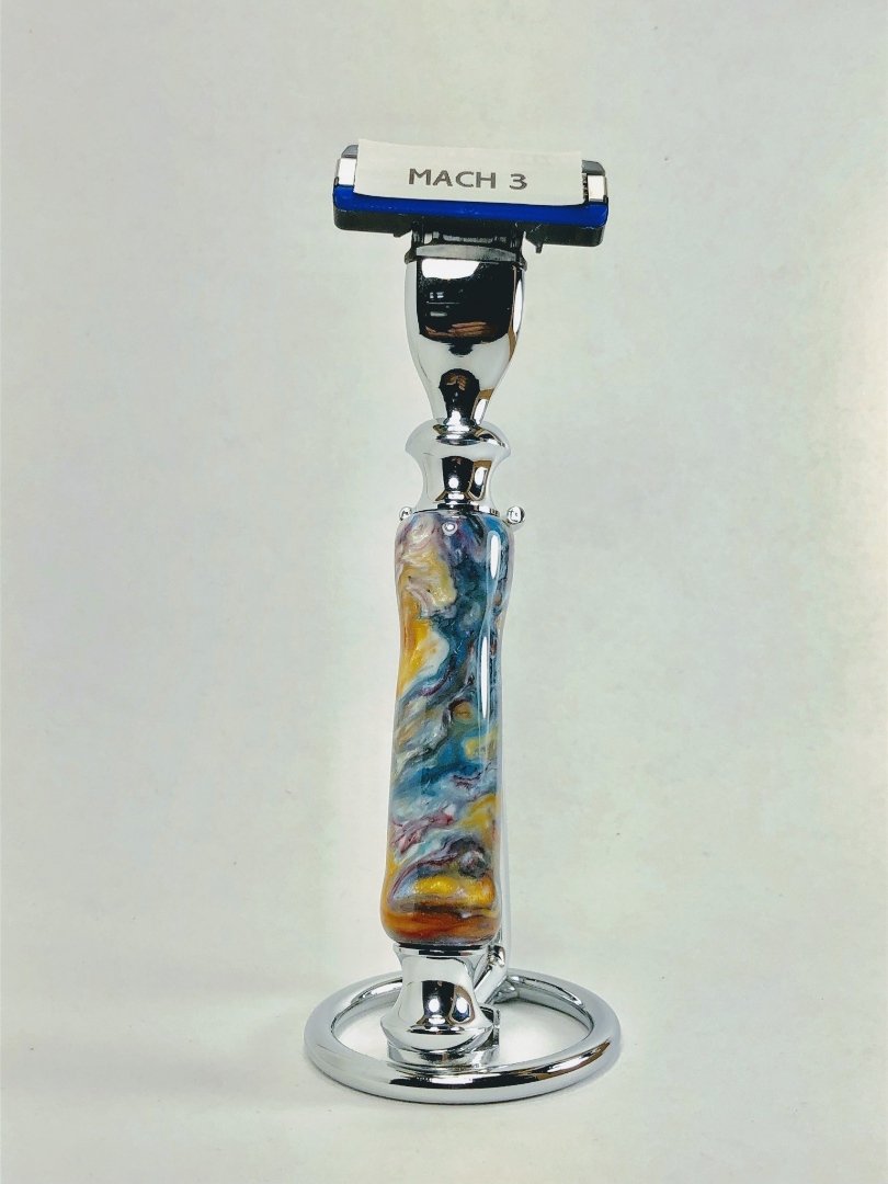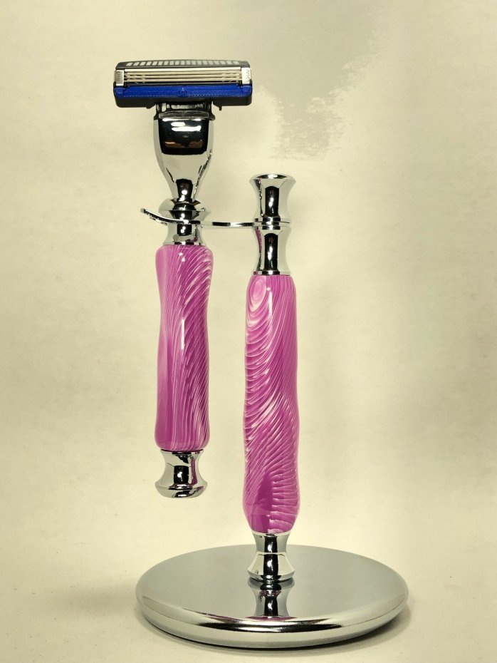 Each handle and base are one of a kind, hand turned acrylic or poly resin. the base is made of coated metal to prevent rusting. The mach 3 style razor styles will fit the Gillette venus/mach3 disposable blades.
